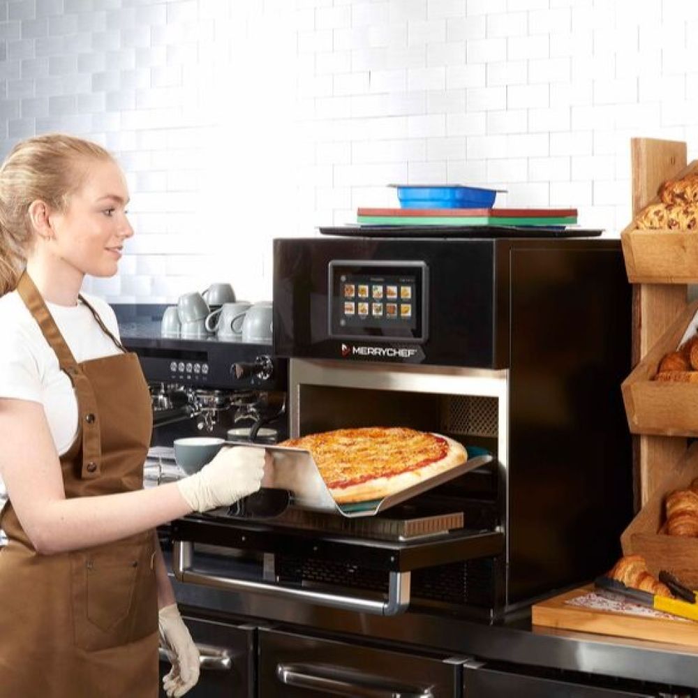 Merrychefin monipuolisin kolmen lämmitysteknologian tehouuni. Kypsentää ruoan nopeasti kiertoilman, impingementlämmön ja mikroaaltojen avulla.